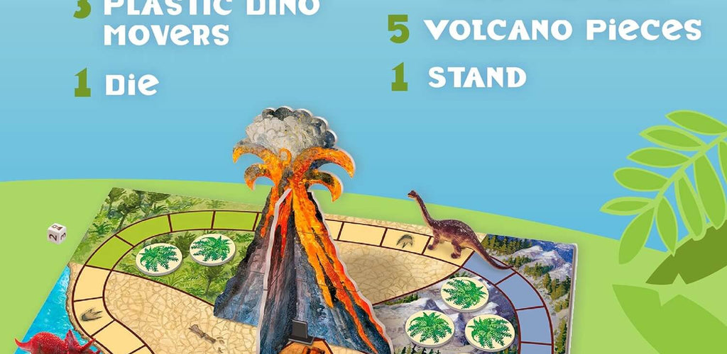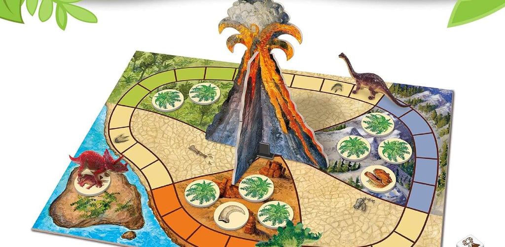 Includes dinosaur figures, game board, and volcano spinner