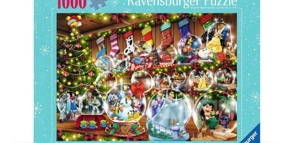 • 1000-piece puzzle featuring Disney characters in festive snow globes.