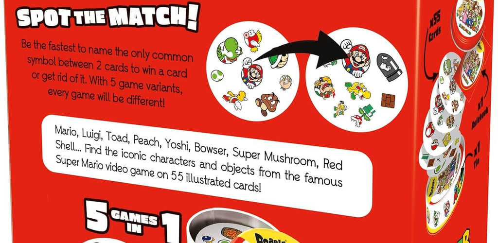 Dobble Super Mario adds classic Nintendo fun to the worldโs fastest observation game. Simple, energetic, and beloved by all ages! ๐ฎ