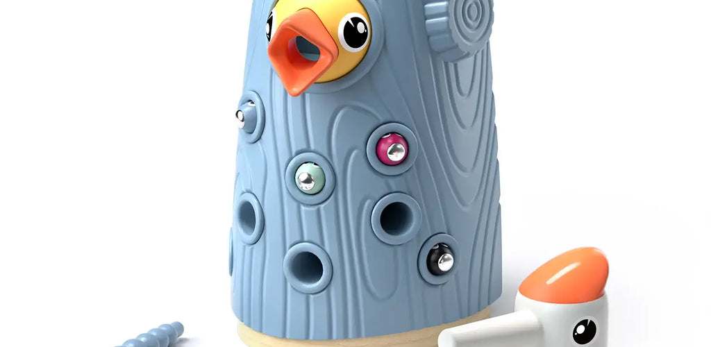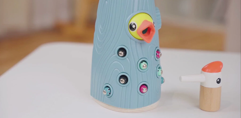 Children use a magnetic beak to feed colorful worms into a wooden tree trunk 🌳