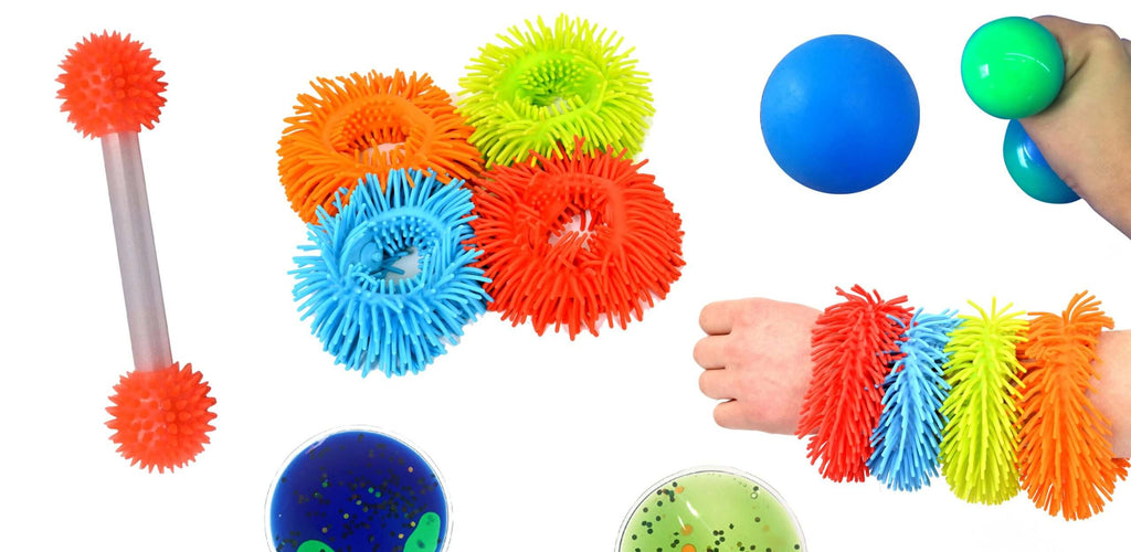 Includes a variety of fidgets such as stress balls, poppers, stretchy bands, and squeezables