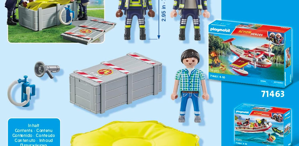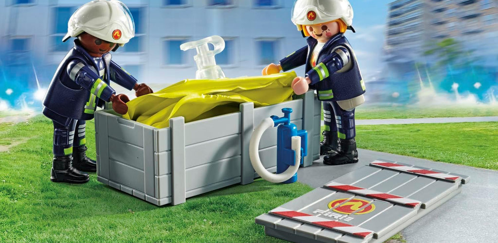 Includes two firefighter figures, a rescue victim figure, inflatable air cushion (air pillow), extinguishers, storage box, and helmet accessories