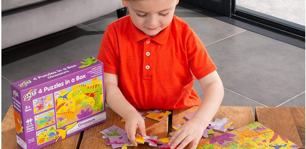The Galt 4 Puzzles in a Box β Dinosaurs set combines fun and learning, giving little dino fans the chance to grow their puzzle skills while exploring prehistoric adventures. Itβs a perfect way to boost confidence and concentration through play. π