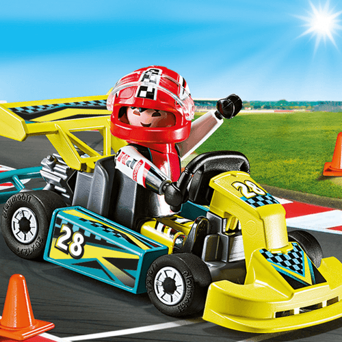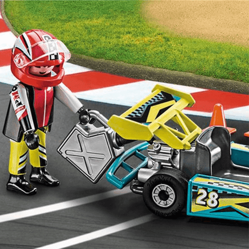 Includes one racer figure, go‑kart, fuel can, traffic pylons, accessories for pit‑stop action