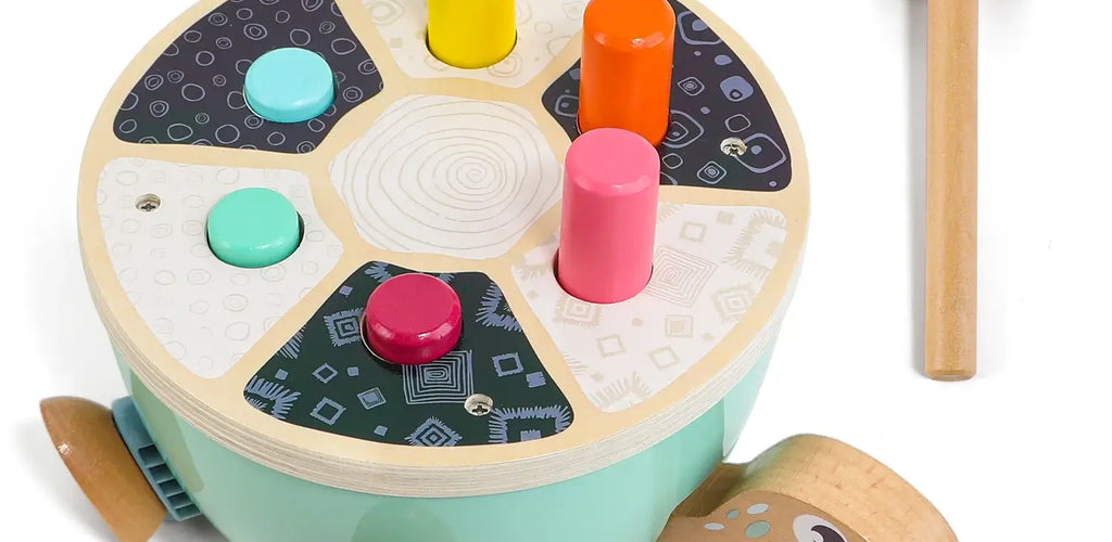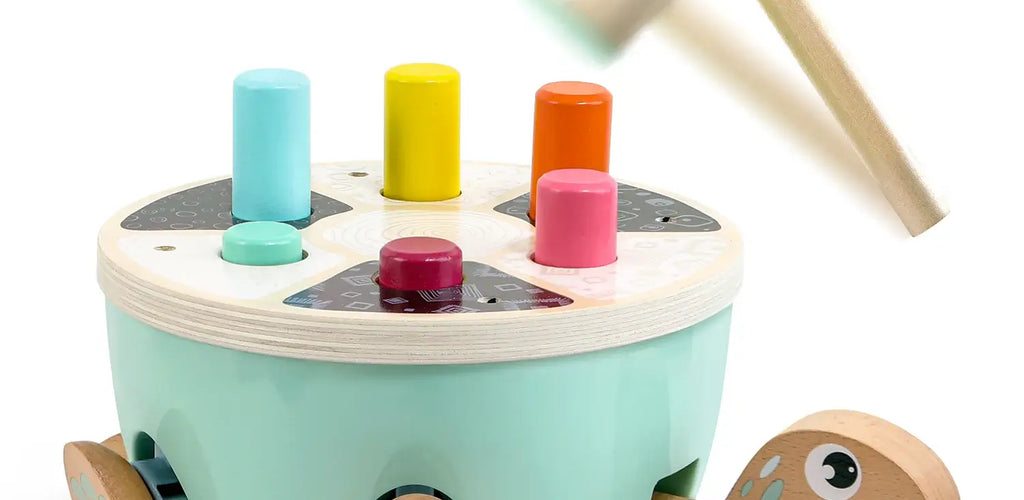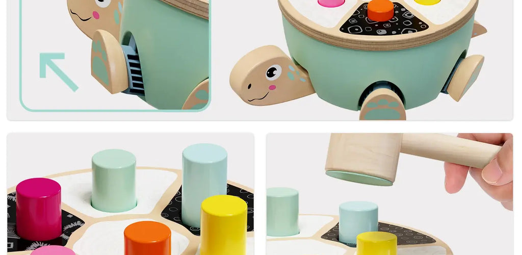 Features a cheerful wooden turtle base with colorful balls and a child-safe hammer 🐢