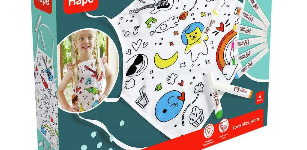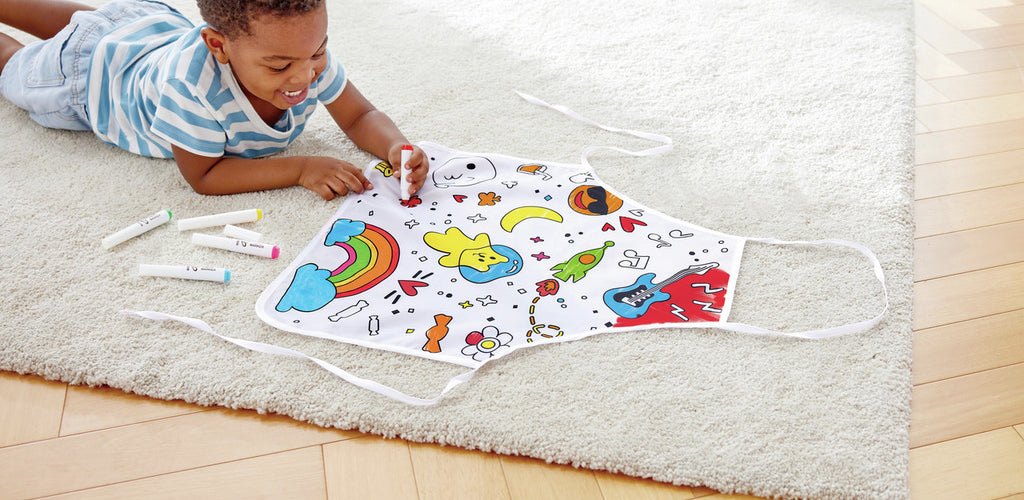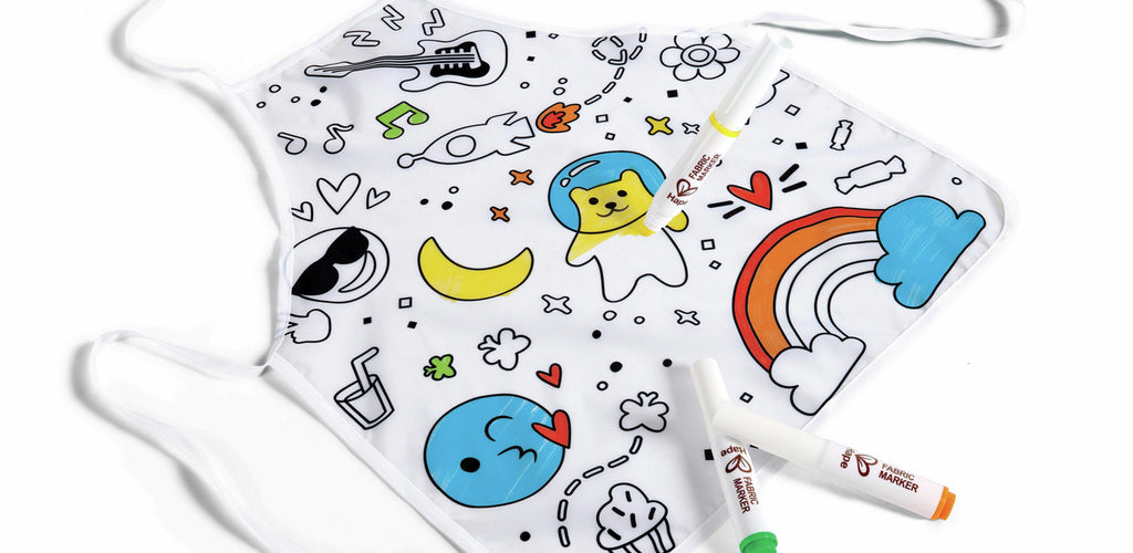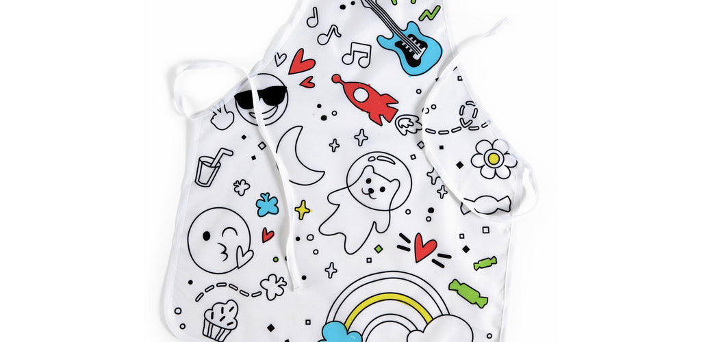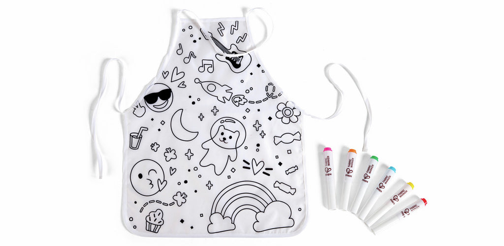 ⢠Whatās Included: 1 waterproof apron with outlined illustrations (rainbows, rockets, music notes) and 6 color markers (green, red, yellow, orange, blue, black)