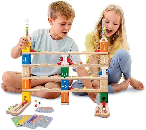 ⢠Whatās Included: 102-piece set including 18 blocks, 2 hole shutters, 1 marble feeder, 10 accelerators, 3 escalating rings, 4 plastic escalating rings, 2 see-saws, 40 marbles, 1 cotton bag, 2 marble collectors, 4 long straight tracks, and 30 coding challenge cards