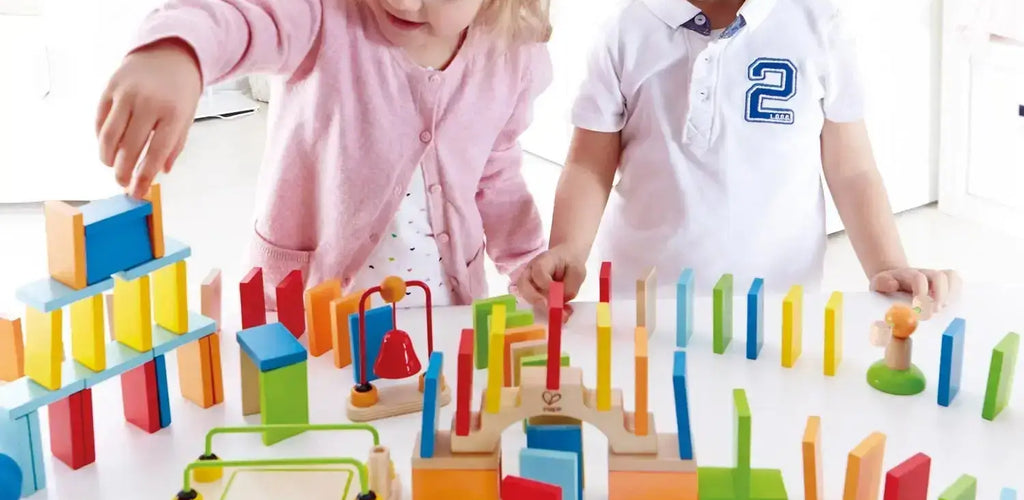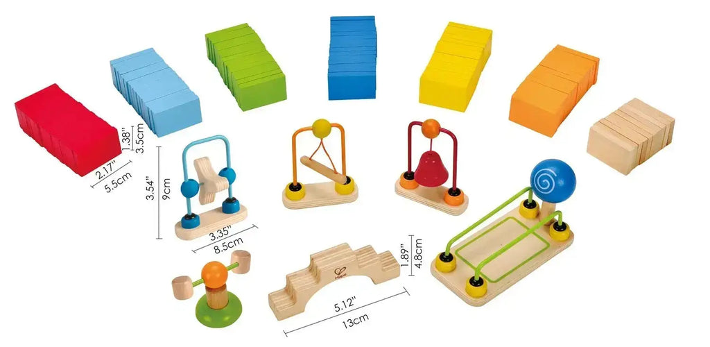 Includes over 100 colorful wooden dominoes plus fun accessories such as a bell, bridge, and special trick pieces 🧩