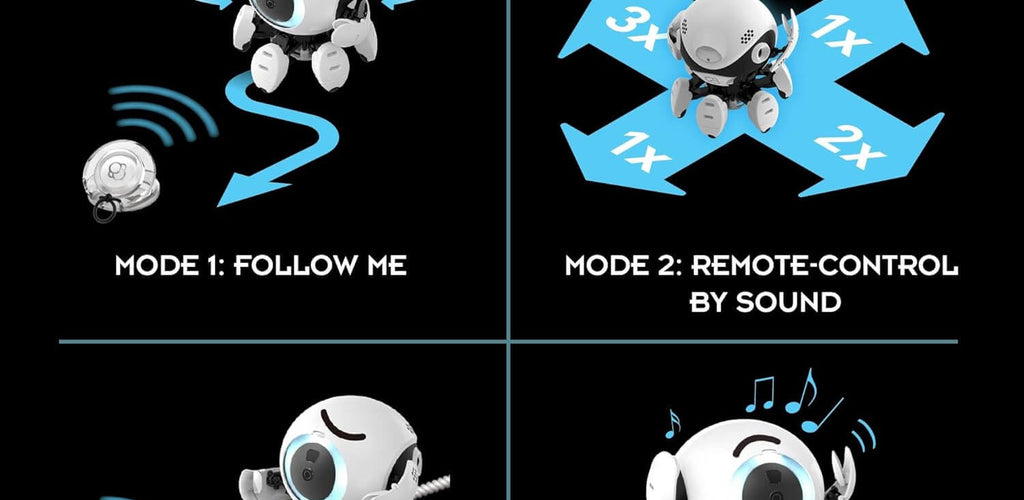 Includes 4 interactive play modes: follow mode (tracks you by sound), response mode (reacts to specific sound sequences), dance mode (moves to music), and tug-of-war mode for playful challenges. 🤖