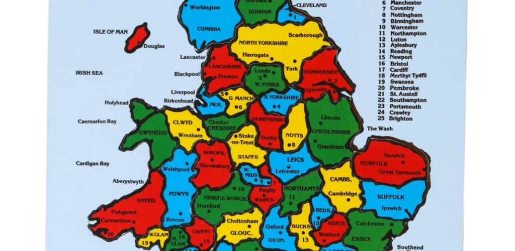 Colourful, handmade wooden jigsaw puzzle featuring a detailed map of England and Wales 🧩