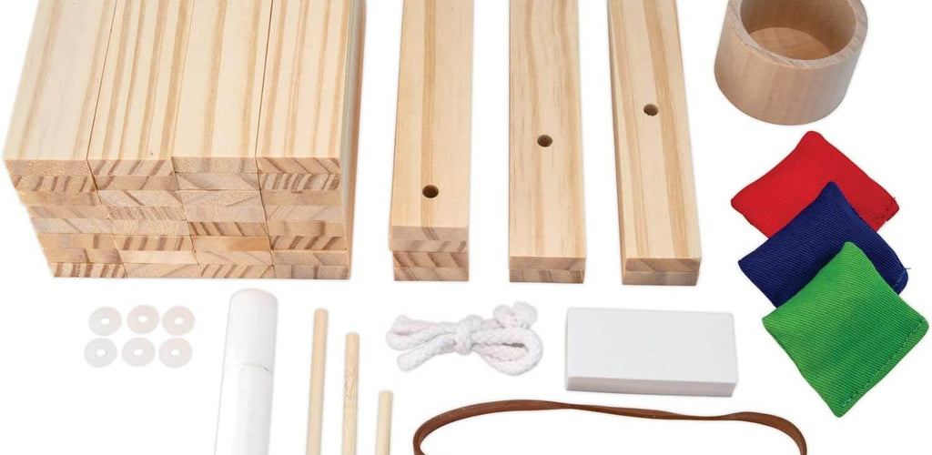 Kit includes precision KEVA planks, rubber bands, and soft projectiles