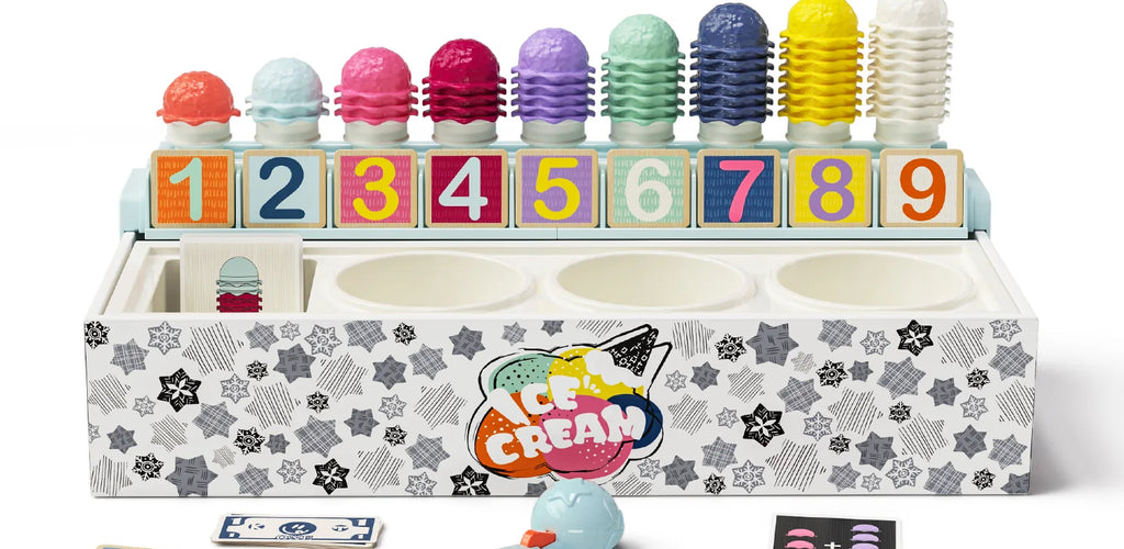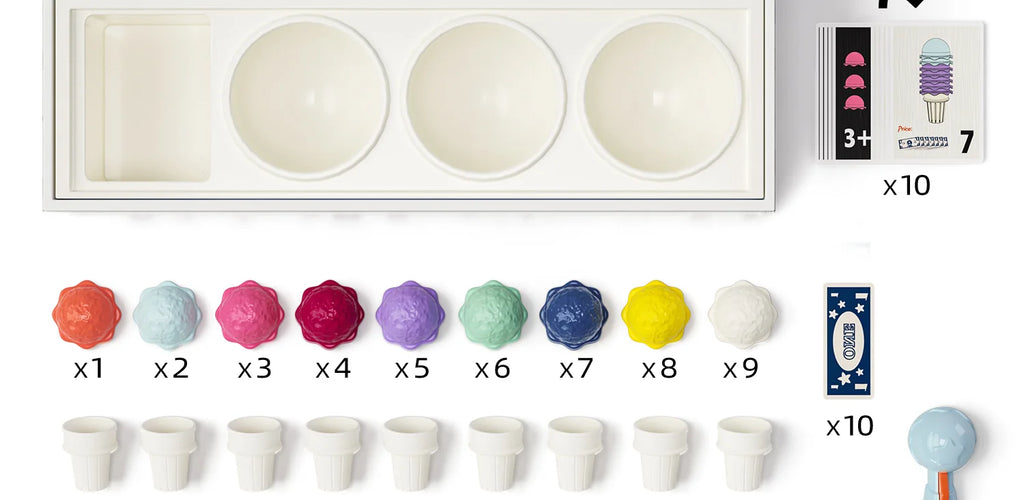 Includes wooden ice cream scoops, cones, flavor tokens, and a sorting box
