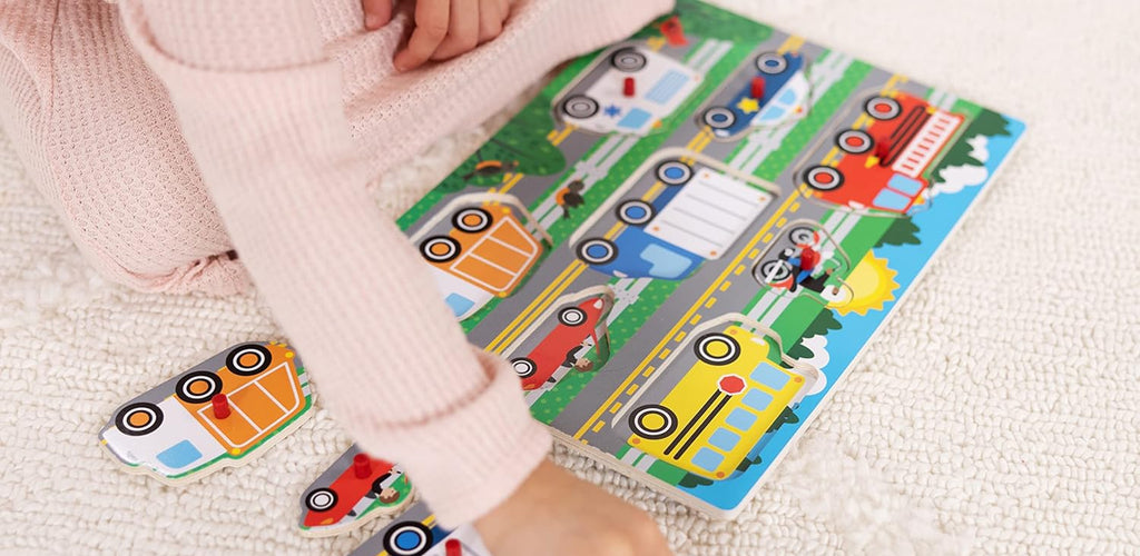 Wooden peg puzzle featuring 8 vehicle-themed pieces with matching images underneath. 🚗