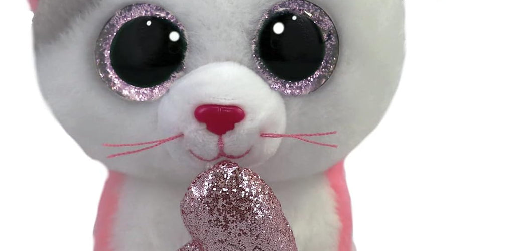 Milena wants to be your Valentine right meow!! This pink kitty cat has sparkly eyes as big as the heart they dragged in. You two would be a purrfect match! Adorable Beanie Boo Multicolored cat carrying heart Sparkly pink glitter eyes Textured Super Sparkle accents Makes a great Valentine's gift or for any occasion Includes official Ty Heart with birthday and poem Surface clean only