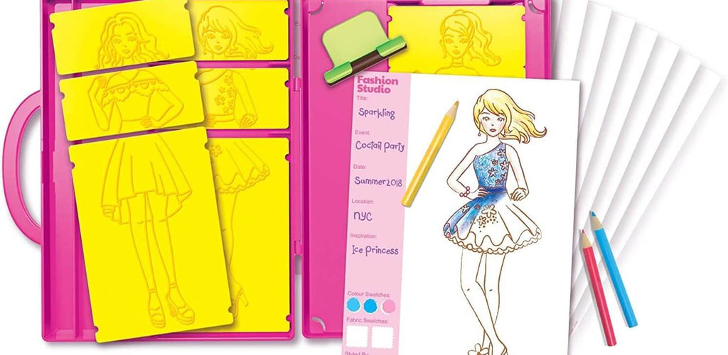 Includes 9 mix-and-match fashion plates, 3 coloured pencils, 1 crayon with holder, 10 sheets of paper, and a stylish case ✏️