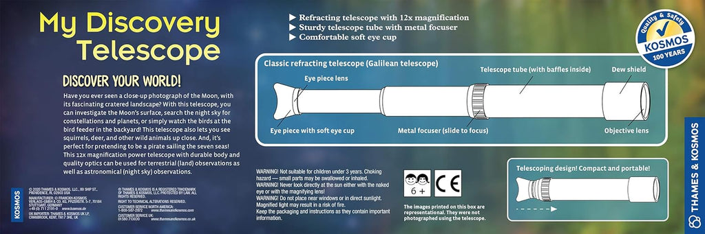 Whatβs in the box: My Discovery Telescope with 12x magnification, soft comfort eyepiece, and user instructions.