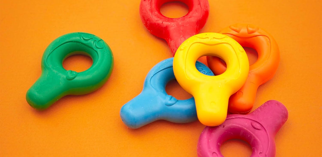 Set of 8 vibrant crayons designed in an ergonomic pebble shape for little hands.