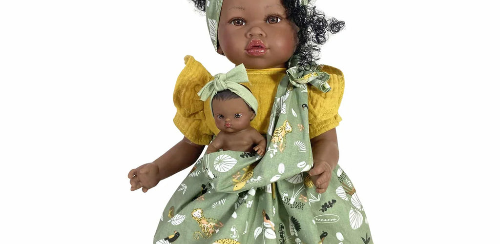 Comes with a matching baby doll, carrier, and African-inspired outfit