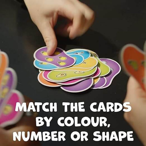 Players race to match pear-shaped objects by color, symbol, or number of symbols