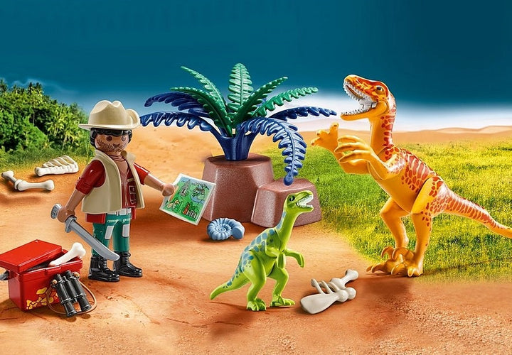 Compact take-along case featuring a brave explorer, dinosaur figure, and accessories