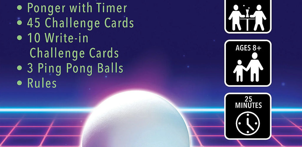 What’s in the box: Timer Ponger, 45 challenge cards, 10 blank write-in cards, 3 ping-pong balls. 📦
