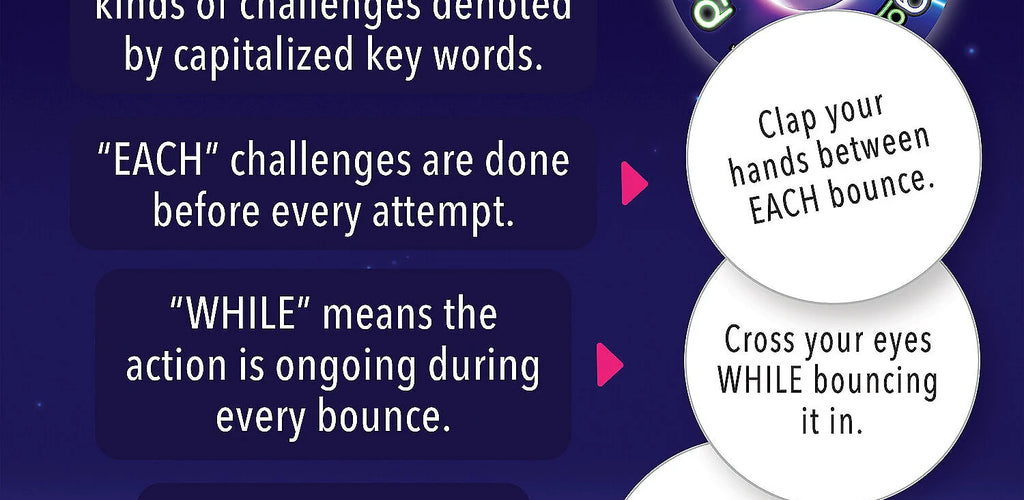 Players draw a card and complete silly, movement-based challenges—like hopping, spinning, or dancing—before bouncing a ping-pong ball into the Ponger.