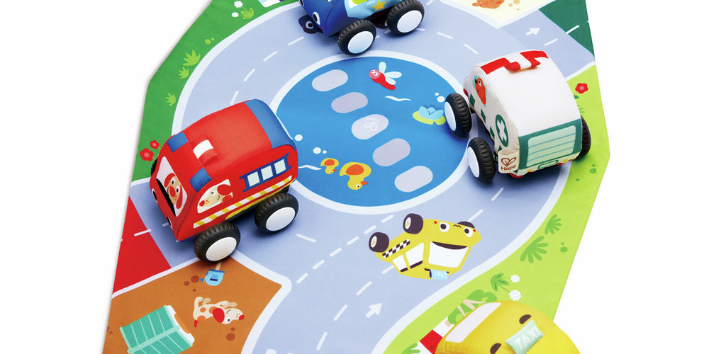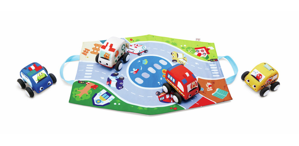 Includes four soft pull-back vehicles: a fire truck, ambulance, police car, and taxi, each with a friendly animal character π
