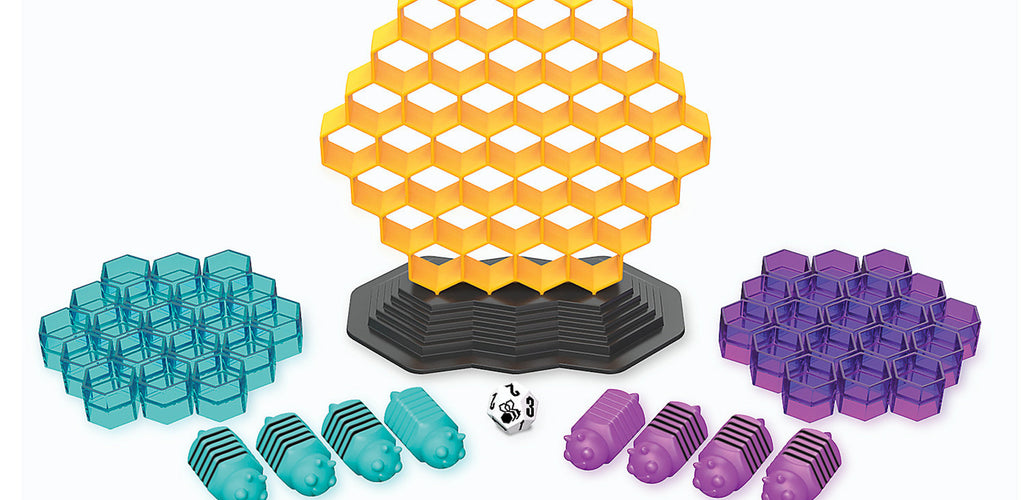 - What's in the box: Honeycomb game board, 38 pollen pieces, 6 worker bees, 2 queen bees, 12-sided die, and game rules.