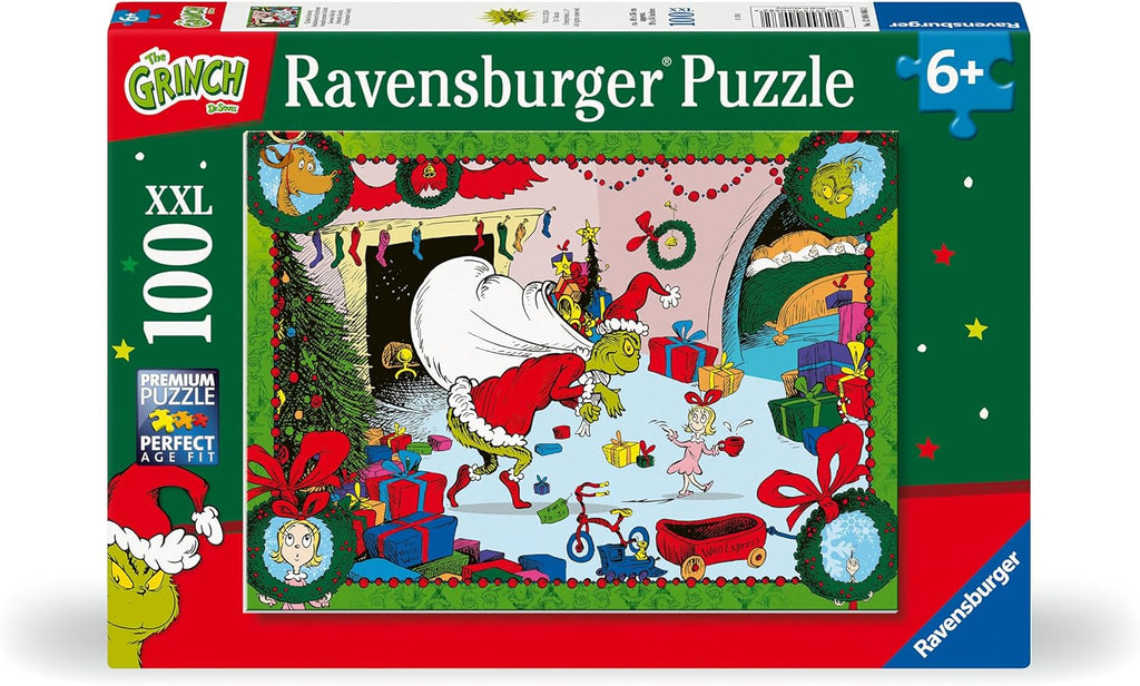 100-piece jigsaw puzzle with festive Grinch artwork for ages 6+. 🎄