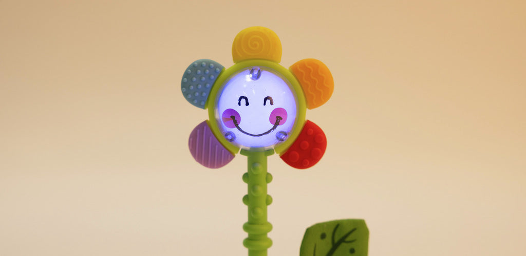 Colourful baby rattle shaped like a smiling flower with soft silicone petals 🌸