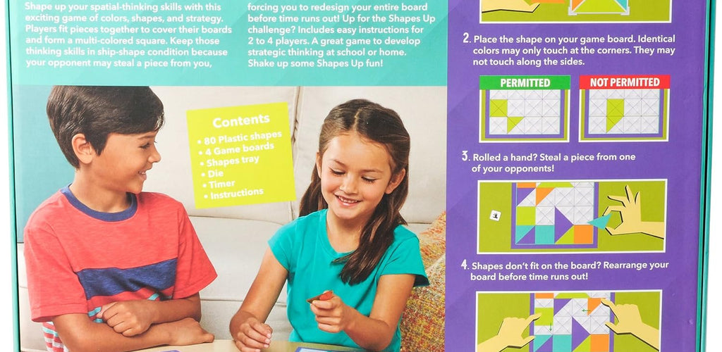 • What’s Included: 80 durable plastic shapes (32 large triangles, 32 small triangles, 16 squares), 4 game boards, shapes tray, die, timer, and instruction guide