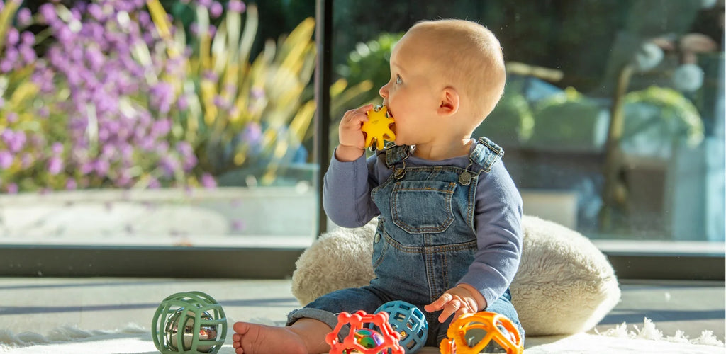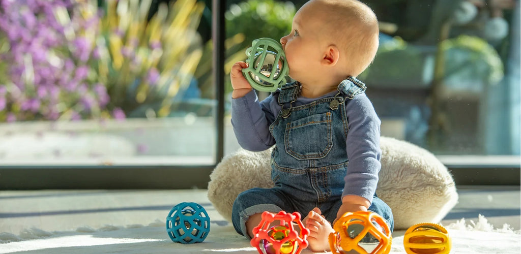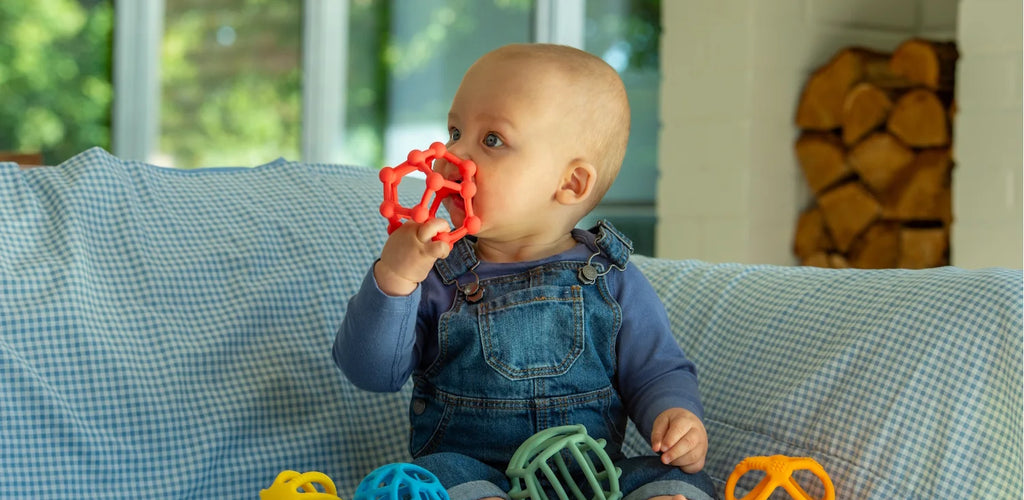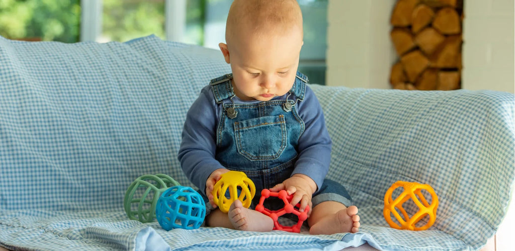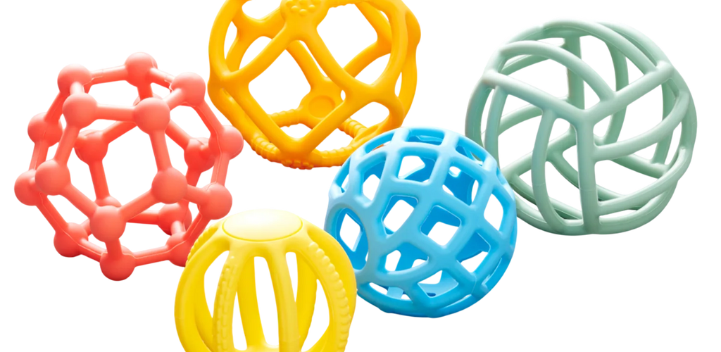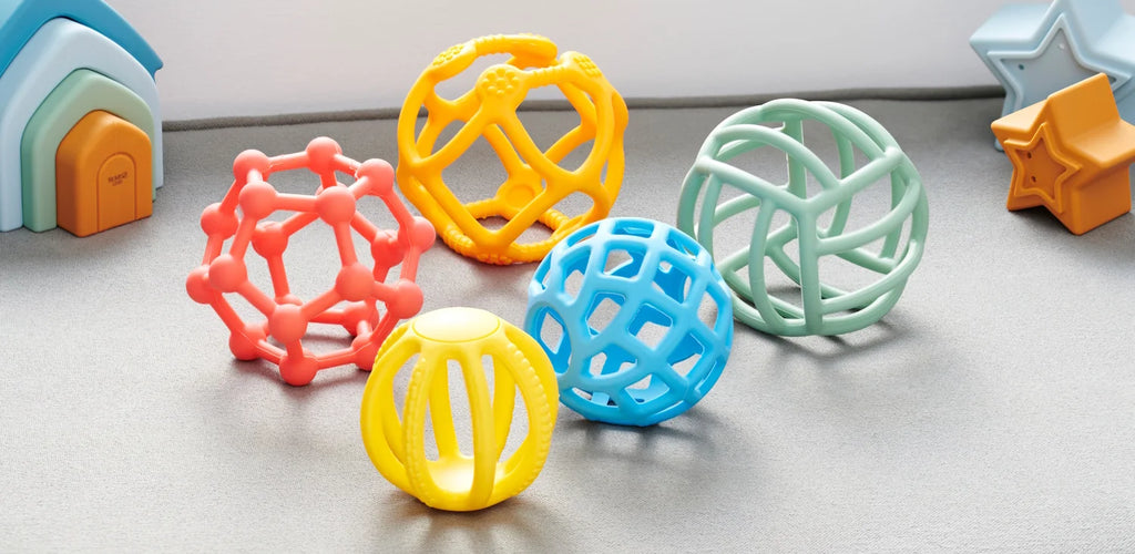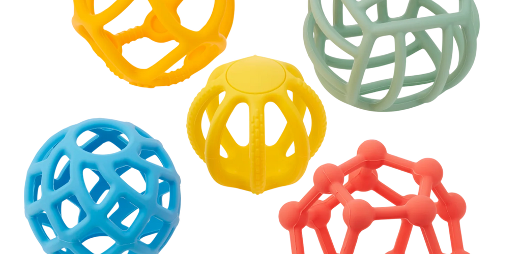 Suitable for babies and toddlers from 10 months and up, this set includes 5 colourful, open-structure silicone balls designed for sensory exploration