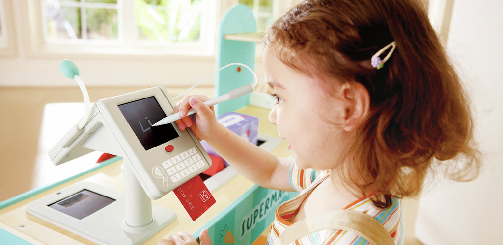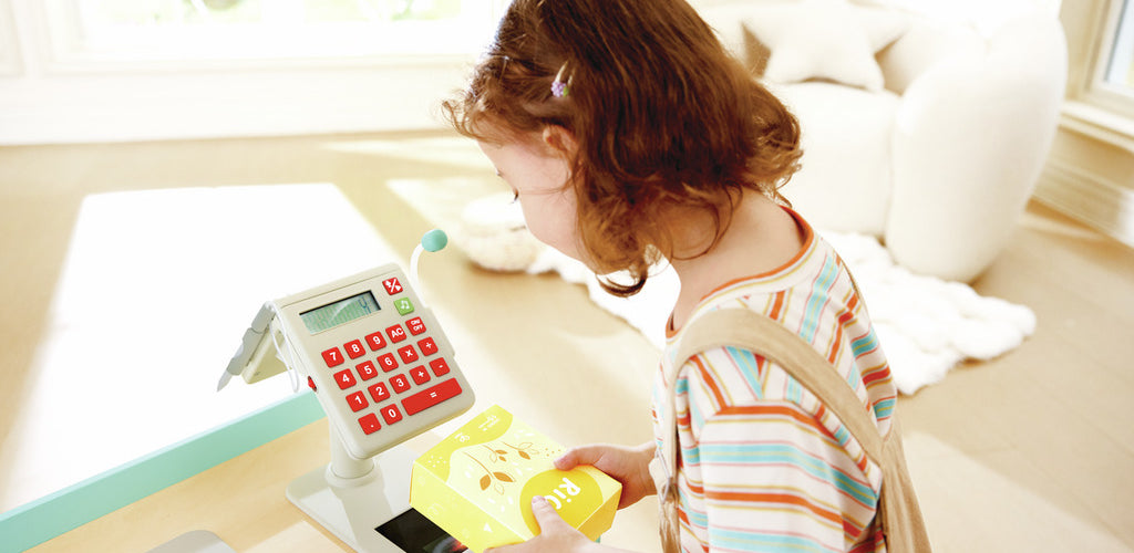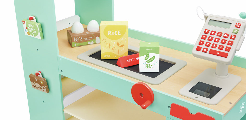 Features a hand-cranked conveyor belt and smart scanner that displays prices for a realistic shopping experience