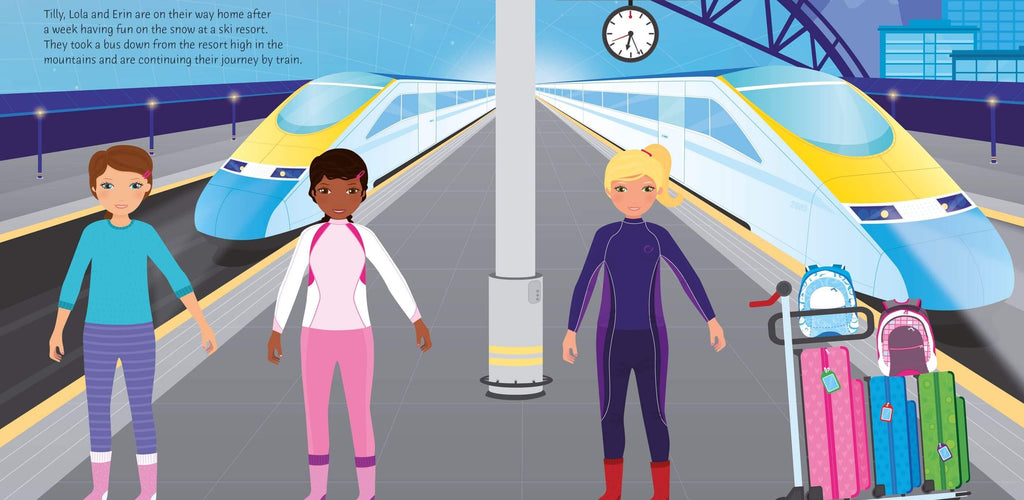 This vibrant sticker book lets children explore the world through fashion and fun. From snowy mountains to sunny beaches, every page is a new journey waiting to be dressed ✈️