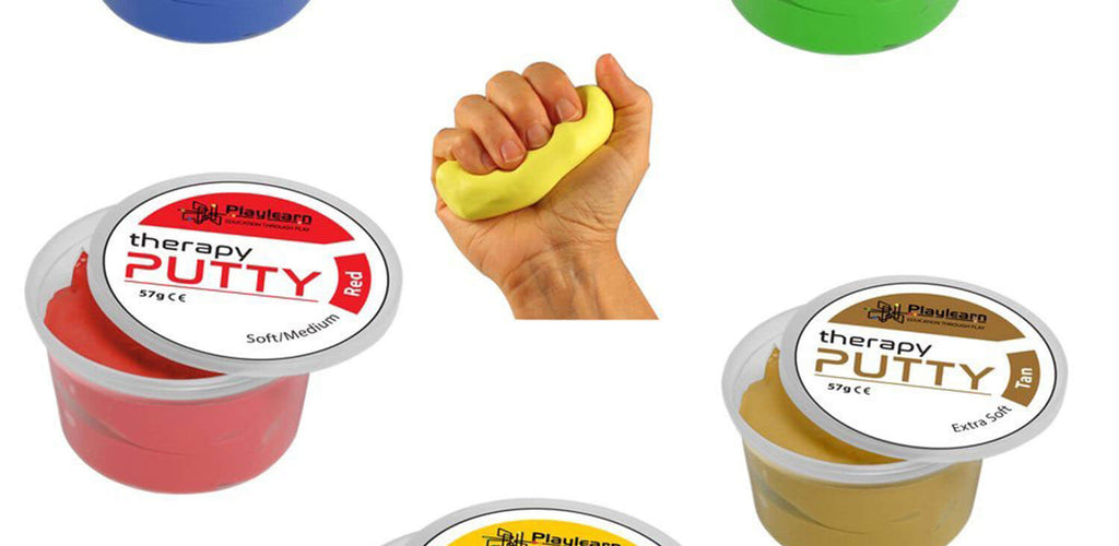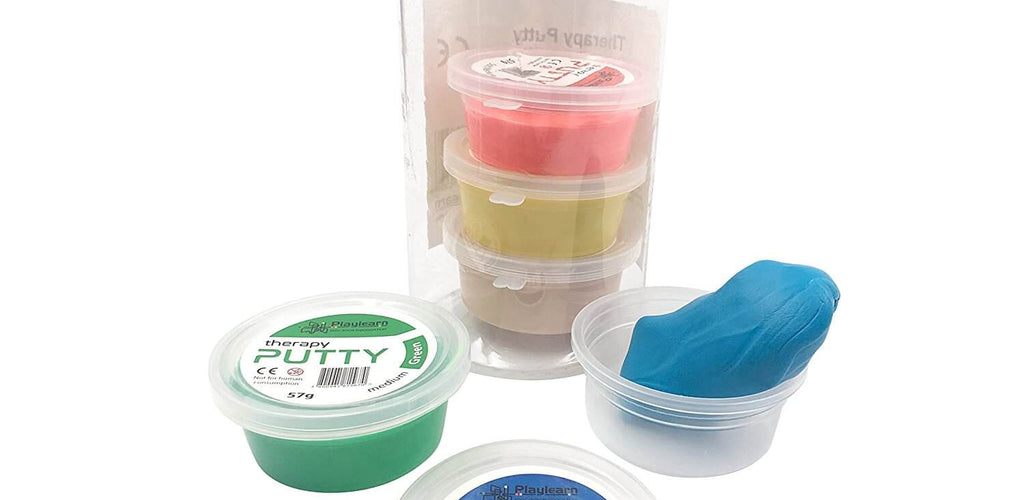 A set of 5 therapy putties in colour-coded resistance levels for strength development ✋