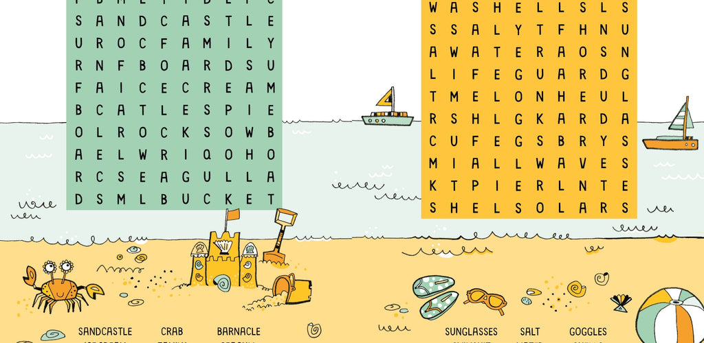 Contains 100 wordsearch puzzles with fun, themed grids and lively illustrations 🏖️