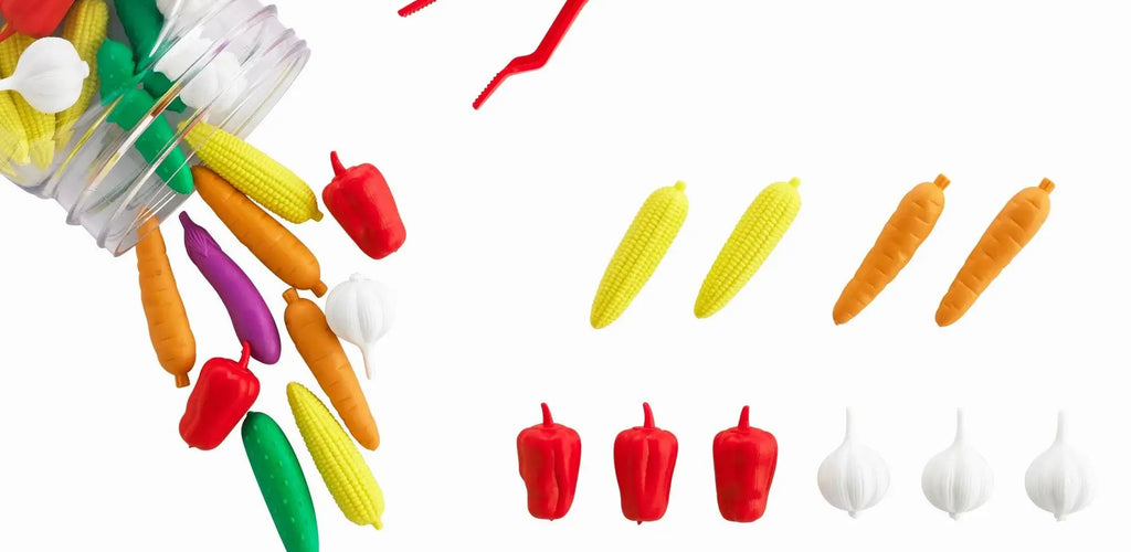 Includes 72 vegetable-shaped counters in 6 different types and 6 bright colors 🥦