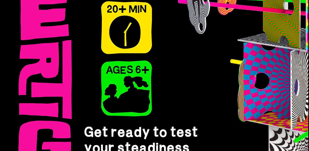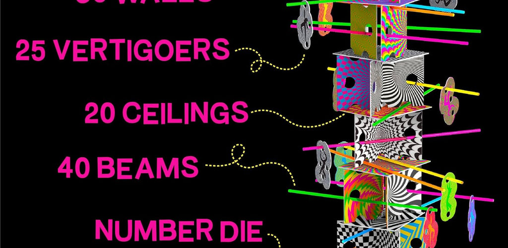 Players take turns adding colourful rods, walls, beams, and components to a towering structure filled with optical-illusion patterns that increase the challenge.