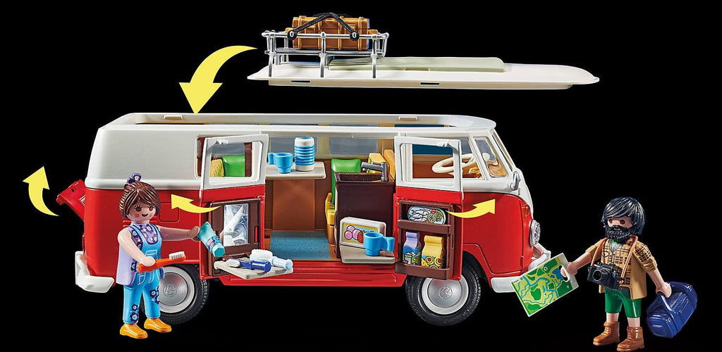 Travel-themed camping set featuring a classic Volkswagen T1 bus with removable roof and detailed retro interior