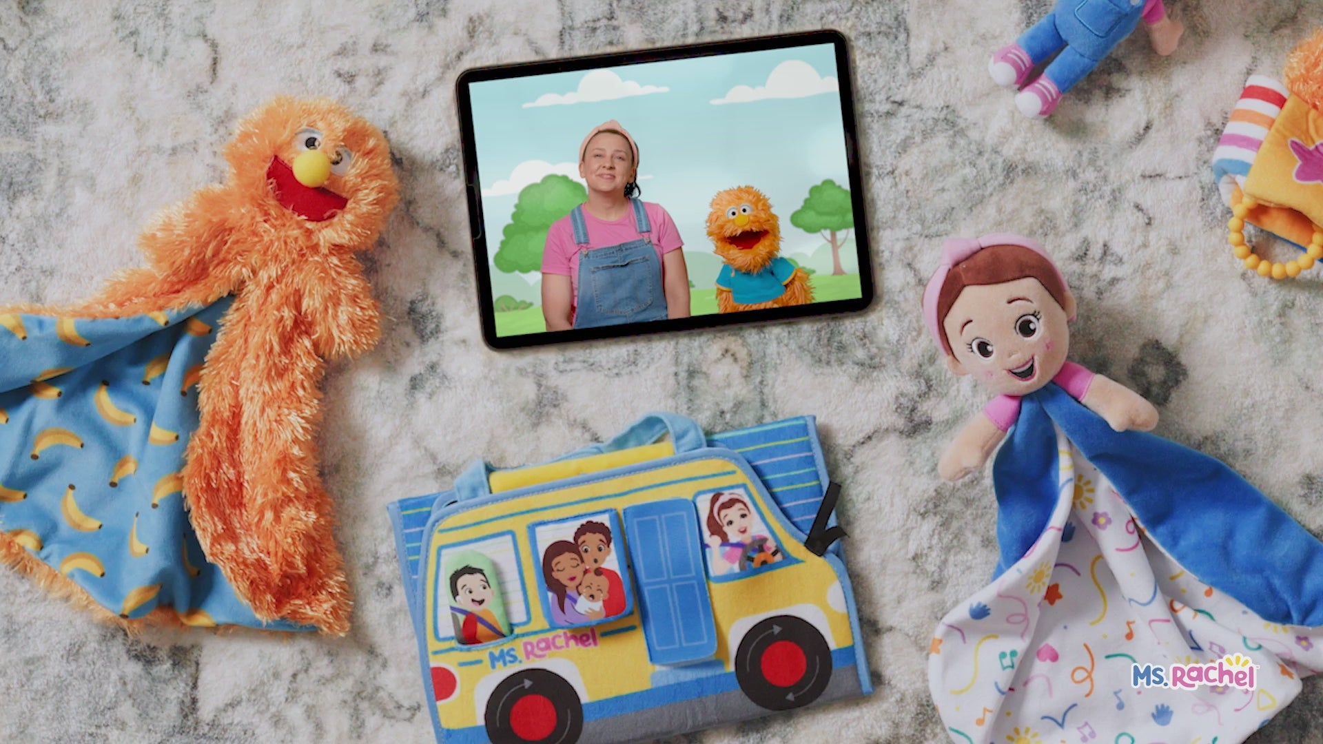 Official Ms. Rachel toy designed as a soft, foldable tummy time mat with a fun Wheels on the Bus theme, perfect for sensory play and early learning. 🚌