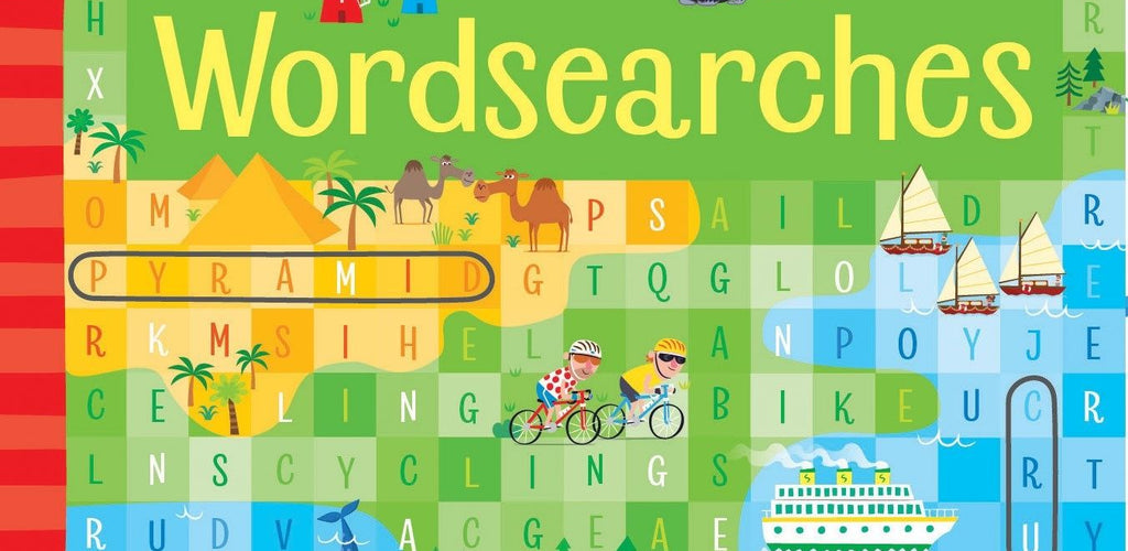 Features themed wordsearches on topics like farm animals, famous buildings, sea creatures, and more